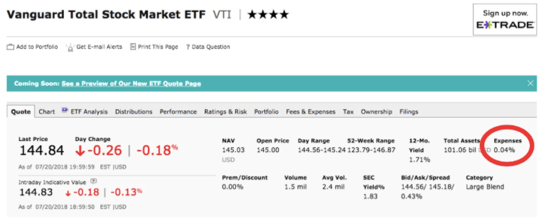 Whatever you invest in, take the time to look up the investments at Morningstar. Just type your investment in the search bar at the top and check the expense ratio. As an example, I typed in VTI, which is the Vanguard Total Stock Market Exchange Traded Fund (ETF). The expense ratio of 0.04% is circled in red:
