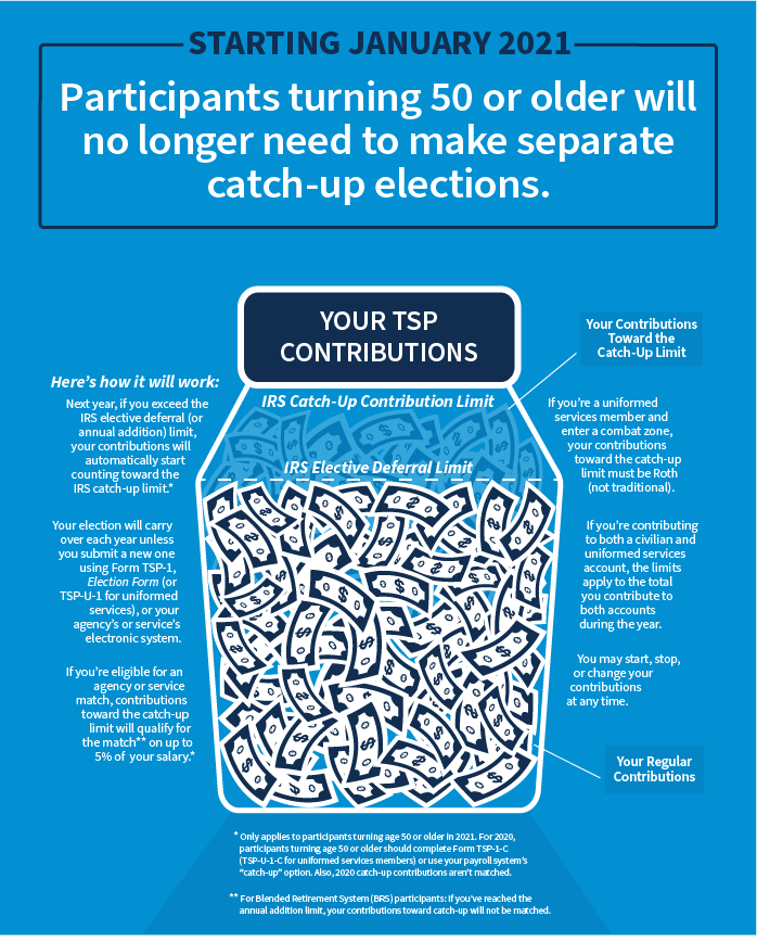 Catch-up contributions are changing — Starting in January 2021, the process for catch-up contributions will be easier for TSP participants. If you’re turning age 50 or older, you’ll no longer need to make separate catch-up elections to your TSP account to contribute toward the catch-up limit.