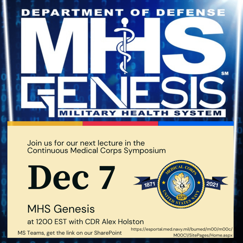 Please join us for the next installment of the Continuous Medical Corps Symposium. We will be having a presentation from CDR Alex Holston, Chief Medical Informatics Officer, on MHS Genesis. This will be a great opportunity for those with Genesis experience to share what they’ve seen and those who are still awaiting the transition to hear from the experts. The lecture will be on 07 Dec at 1200 EST via MS Teams (link is on the MC Sharepoint). Please disseminate this information widely to encourage maximum participation.