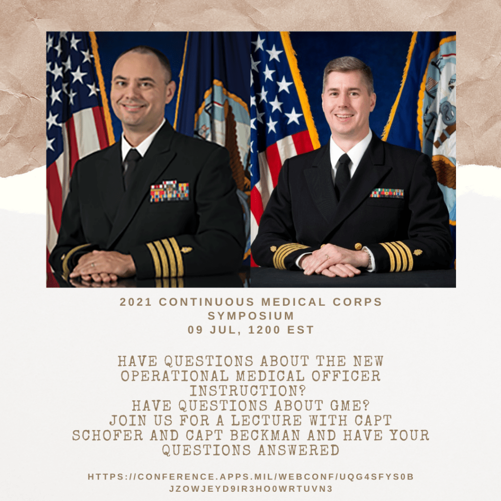 The next lecture series for the 2021 Continuous Medical Corps Symposium will be with CAPT Joel Schofer and CAPT William Beckman on the new Operational Medical Officer Instruction and Graduate Medical Education. There will be a short presentation followed by a question/answer session to try to answer questions regarding this new instruction and what to expect from GME. Please join us on Friday 09 July at 1200 EST, https://conference.apps.mil/webconf/uqg4sfys0bjzowjeyd9ir3ho0wrtuvn3