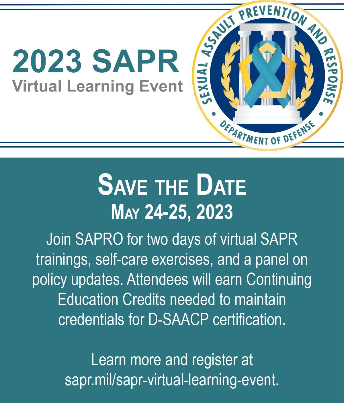 The US DOD Sexual Assault Prevention and Response Office (SAPRO) promote military readiness by eliminating sexual assault and ensuring excellence in victim advocacy and prevention efforts through the execution of SAPR policy, planning, and oversight across the DoD Community. The SAPRO has a virtual learning event on May 24-25, 2023. Learn more with the attached flyer and register at https://sapr.mil/sapr-virtual-learning-event.