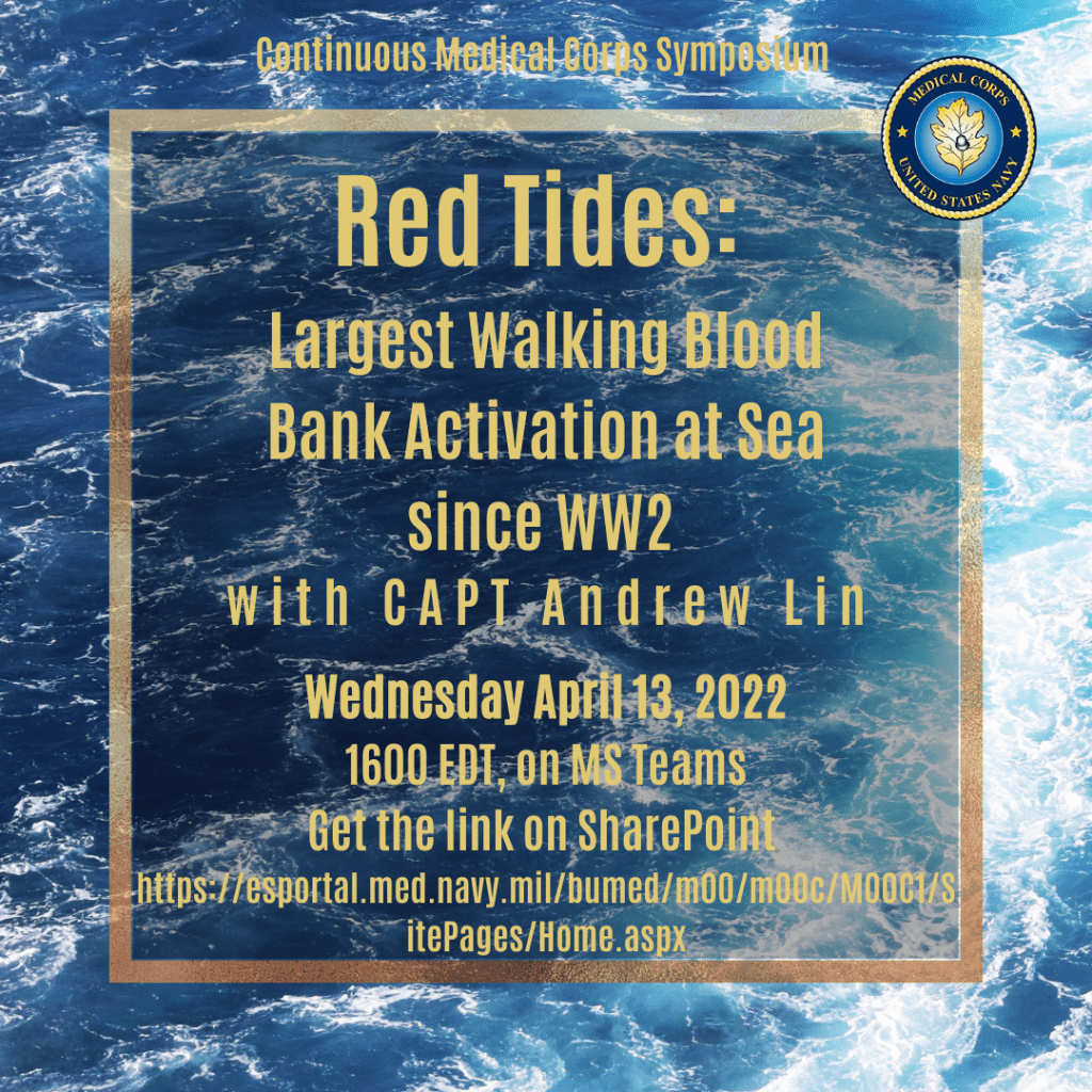 Please join us for the next installment of the Continuous Medical Corps Symposium lecture series on 13 April at 1600 EDT for a talk with CAPT Andrew Lin on the largest walking blood bank activation at sea since WW2. Please disseminate this information widely to ensure maximum participation and looking forward to this insightful talk.