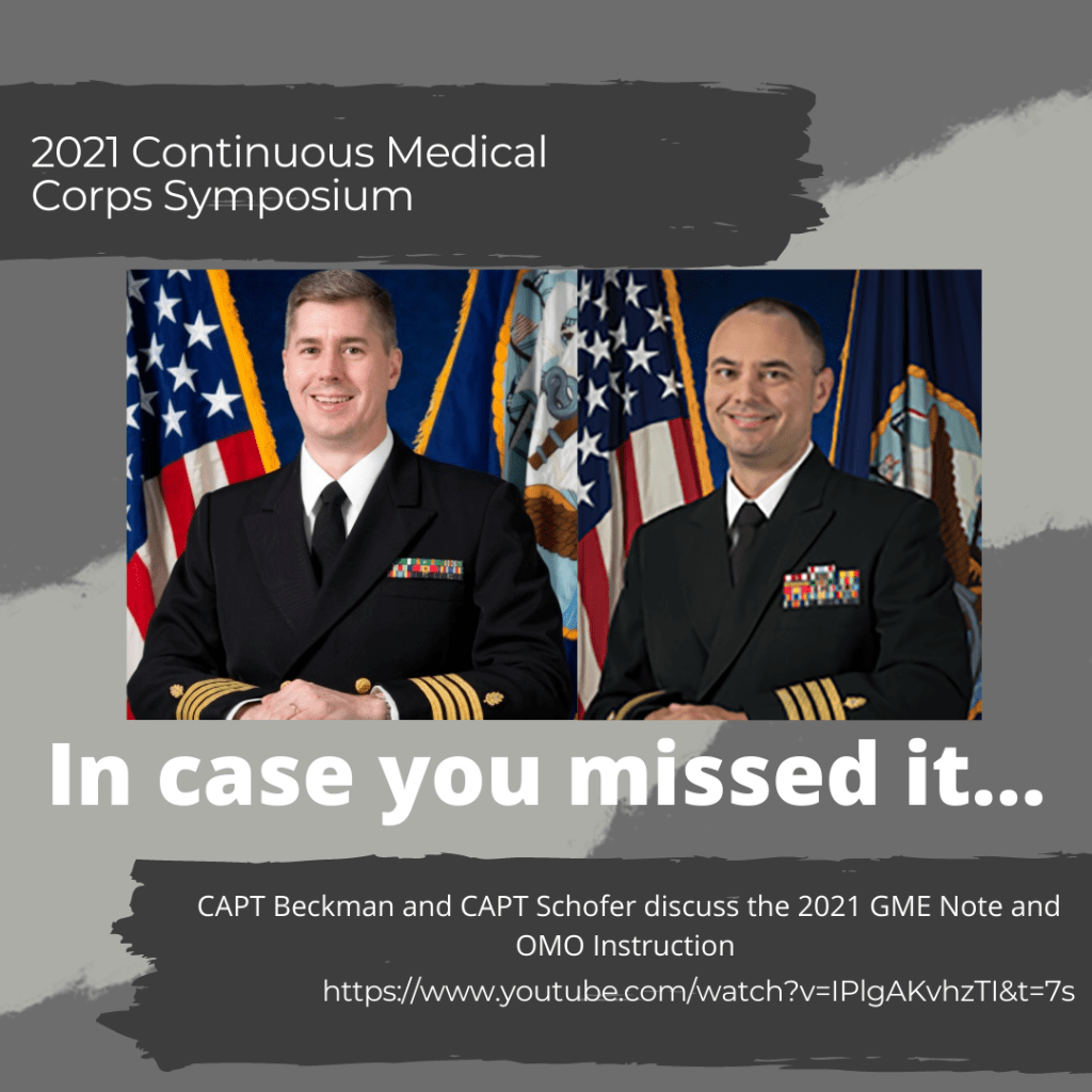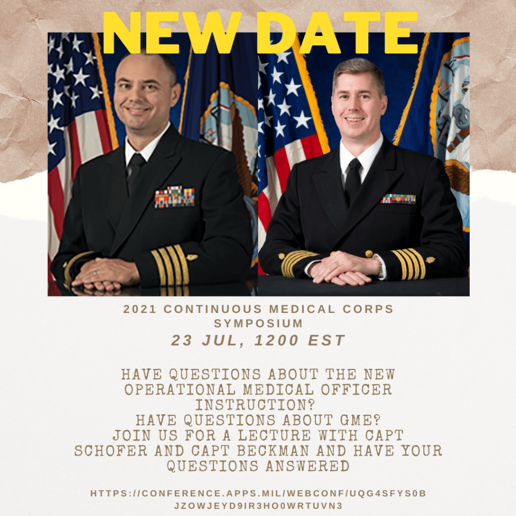 The next lecture series for the 2021 Continuous Medical Corps Symposium will be with CAPT Joel Schofer and CAPT William Beckman on the new Operational Medical Officer Instruction and Graduate Medical Education. There will be a short presentation followed by a question/answer session to try to answer questions regarding this new instruction and what to expect from GME. Please join us on Friday 09 July at 1200 EST, https://conference.apps.mil/webconf/uqg4sfys0bjzowjeyd9ir3ho0wrtuvn3