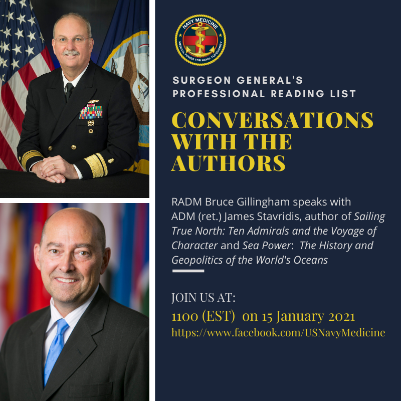 Tomorrow at 1100 the Surgeon General will be speaking with ADM (ret.) James Stavridis on Facebook Live as part of the “Conversations with the Authors” Series. The topic of conversation will be Stavridis’s books “Sailing True North: Ten Admirals and the Voyage of Character” and “Sea Power: The History and Geopolitics of the World’s Oceans” and their application to Navy Medicine. As a Facebook Live event this will be open to the Enterprise and we encourage all BUMED personnel to watch on the BUMED Facebook site.